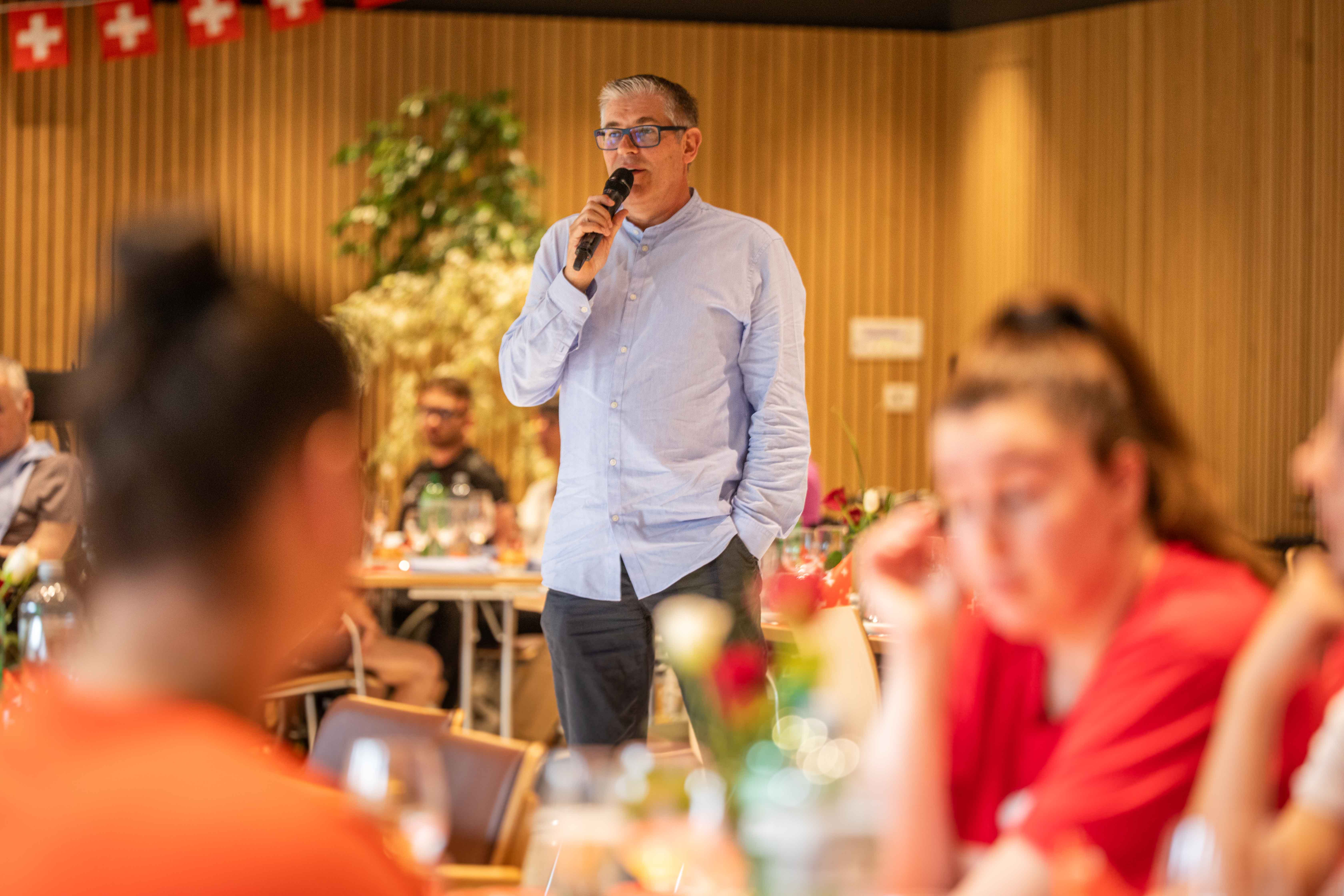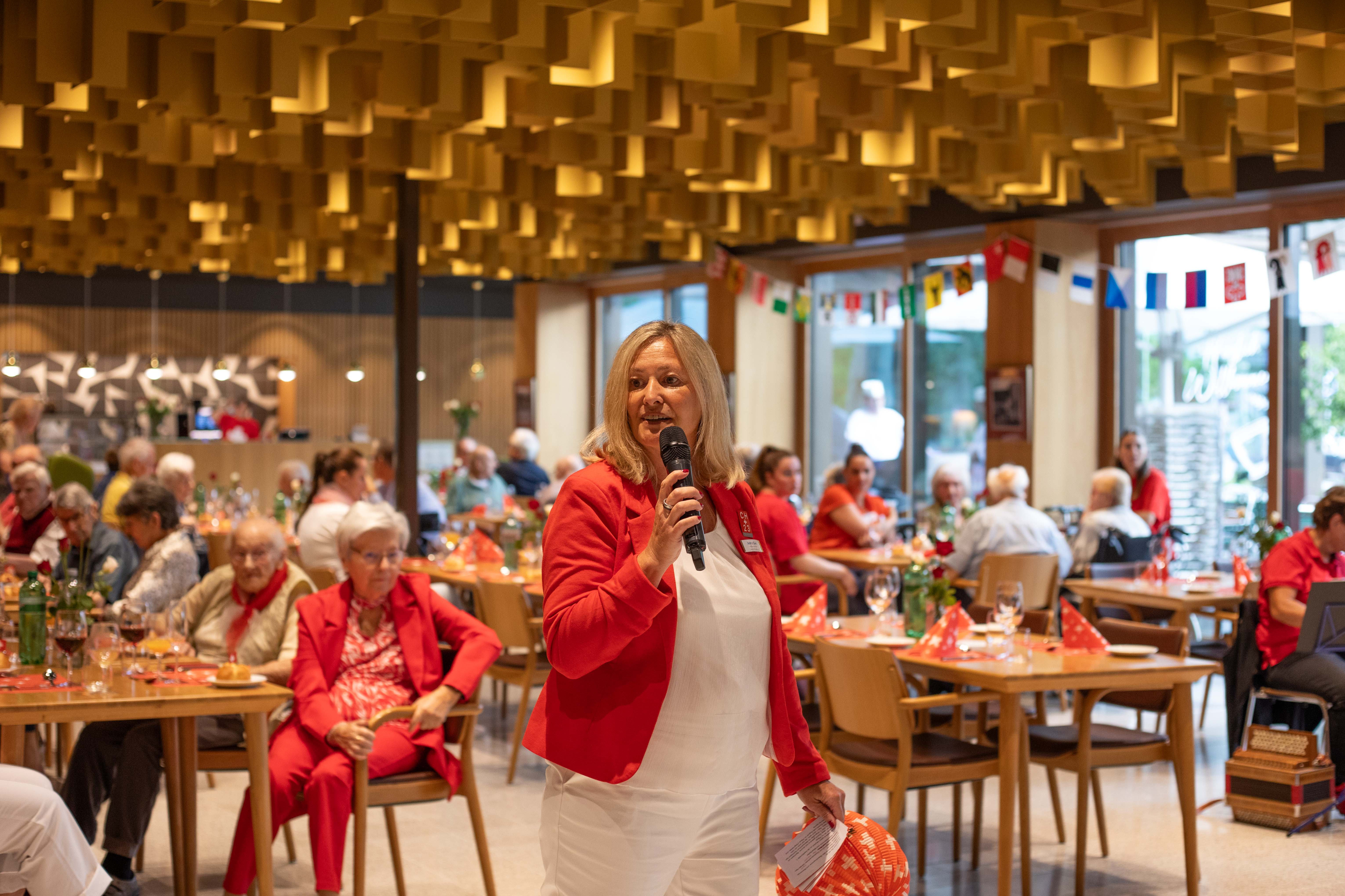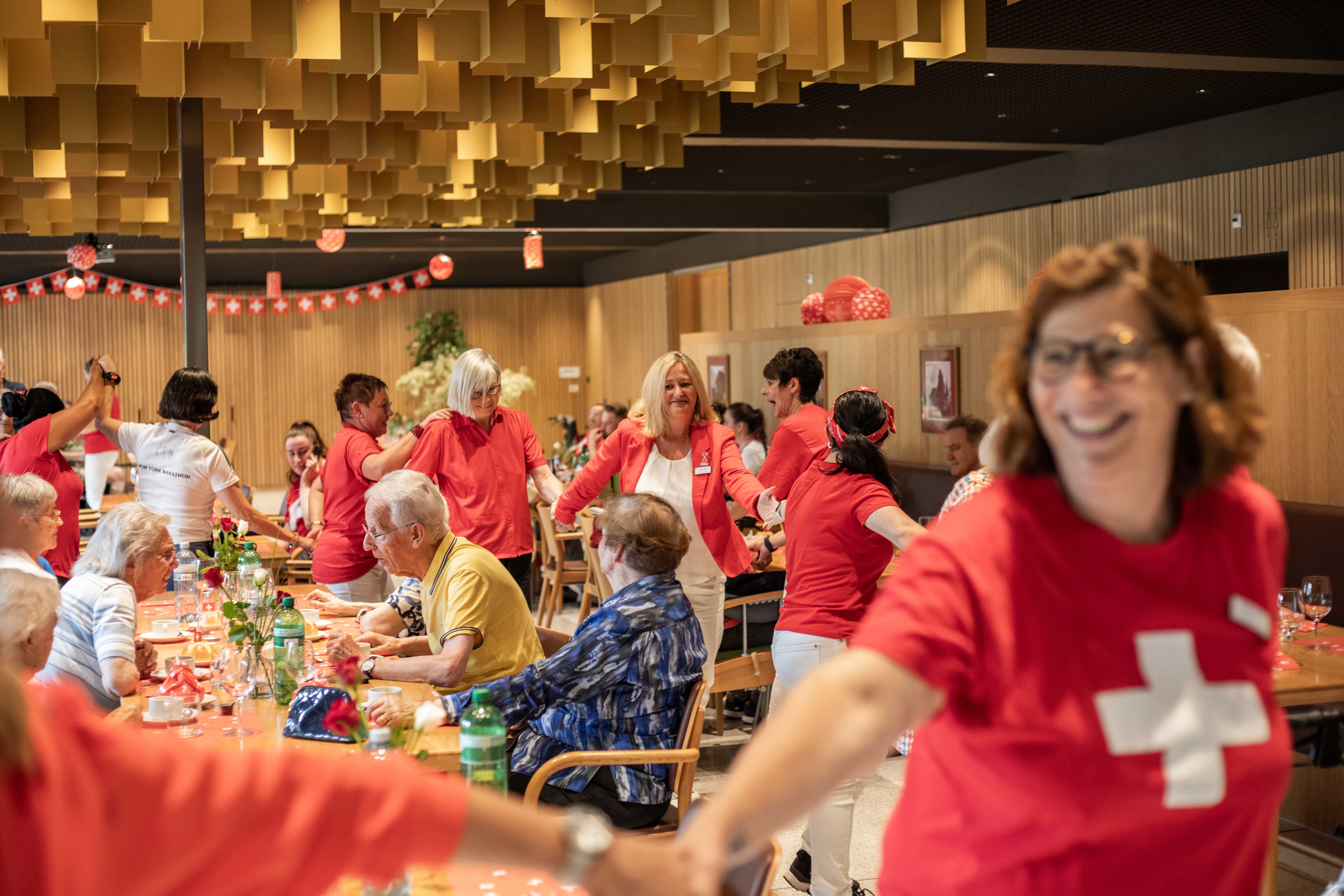 Frisches vom Grill stand auf dem Menüplan, doch die Wetterprognosen für den heutigen Dienstag wurden schlechter und schlechter. Anstatt bei bestem Sonnenschein die frische Luft geniessen zu können und einen Cervelat zu verspeisen, mussten wir umplanen und Bistro und Mehrzwecksaal zusammenschliessen. Erfreulicherweise tat das Wetter der Stimmung keinen Abbruch, ganz im Gegenteil. Zu den ländlichen Klängen der "Ü50-Örgeler" wurde ausgelassen gefeiert und getanzt. Eine Polonaise zog sich quer durch den grossen Saal, hindurch zwischen Stühlen und Bänken, vorbei am Empangsthresen und den Musikern. Unsere Bewohner:innen der drei Abteilungen Rhytalblick, Chilebückli und Rappenschnabel haben den heutigen Nationalfeiertag gemeinsam mit den Patienten der Rückendwind + AG in Angriff genommen. Ich denke die vielen lachenden und strahlenden Gesichter sind ausdruck genug, dass dies einmal mehr ein äussert gelungenes Event war. Danke an alle beteiligten.